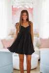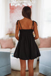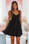 This Sultry Summer Nights Mini Dress in black features playful bubbled fabric, adjustable shoulder ties for a perfect fit, and smocking in the back that adds a flirty touch. Ideal for warm evenings, it combines comfort with a chic, fun style that moves with you.