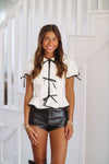 This poplin top has front ties and a contrasting piped hem and bow detail.