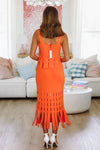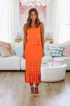 Add a pop of fun to your gameday look with the Tangerine Glow Midi Skirt. Its playful fringe detail pairs perfectly with sneakers for effortless style and movement. Plus, don’t miss the matching top to complete your vibrant outfit!