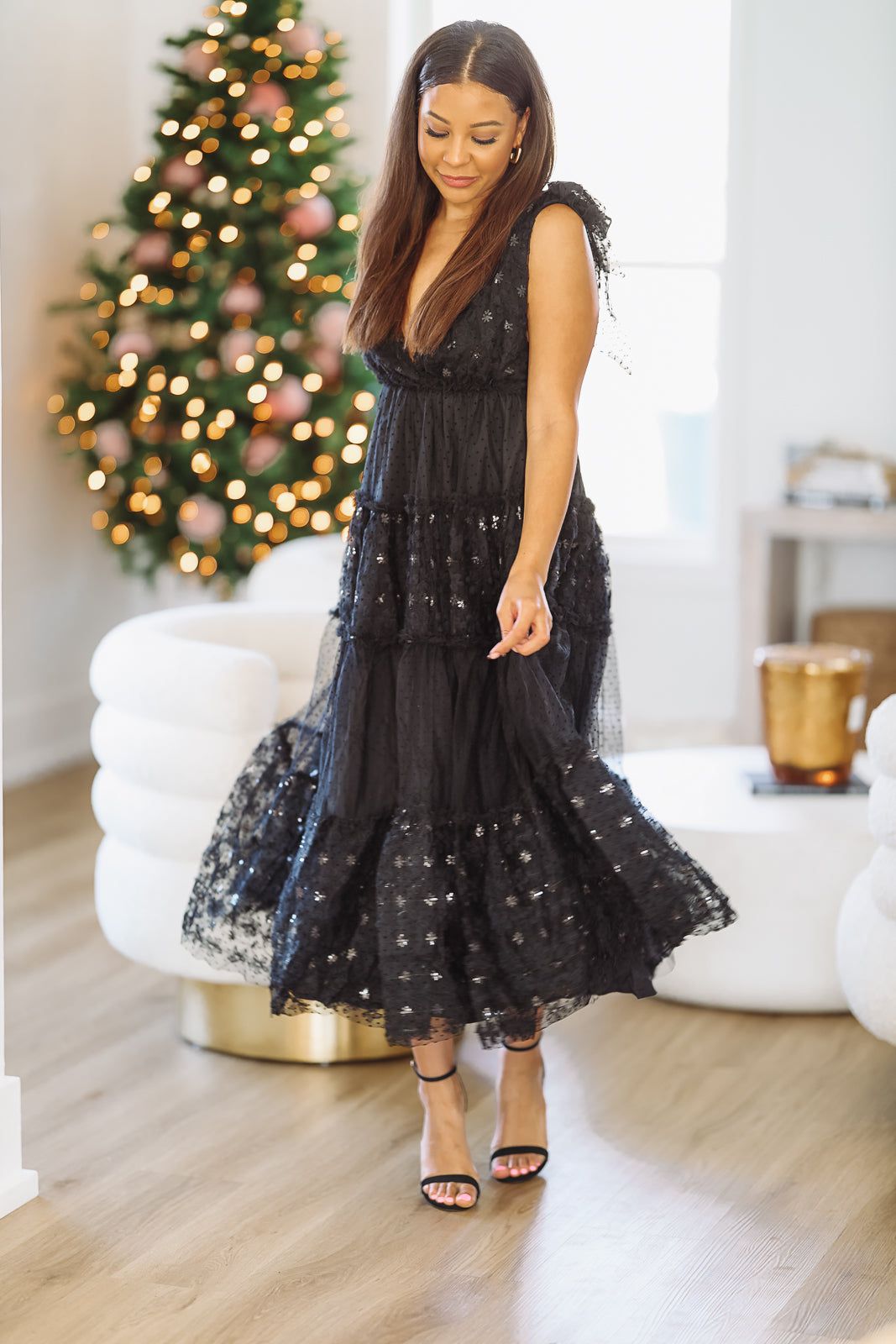 How adorable is this maxi dress gown that is perfect for events this season! This dress is giving designer vibes featuring tie tulle straps, layered polka dot and floral tulle mesh and tiered ruffle detailing.