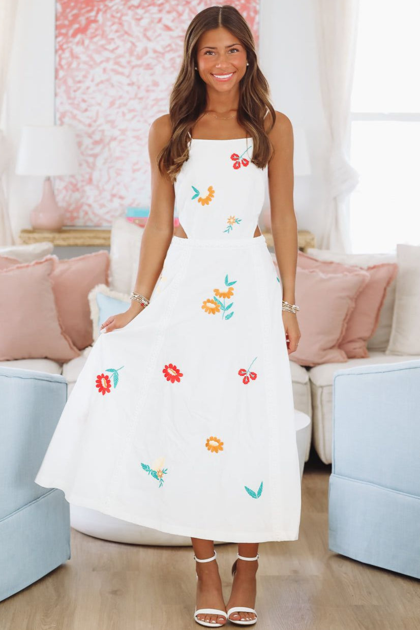This open back, embroidered midi dress is so stylish!
