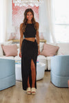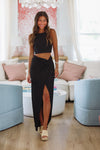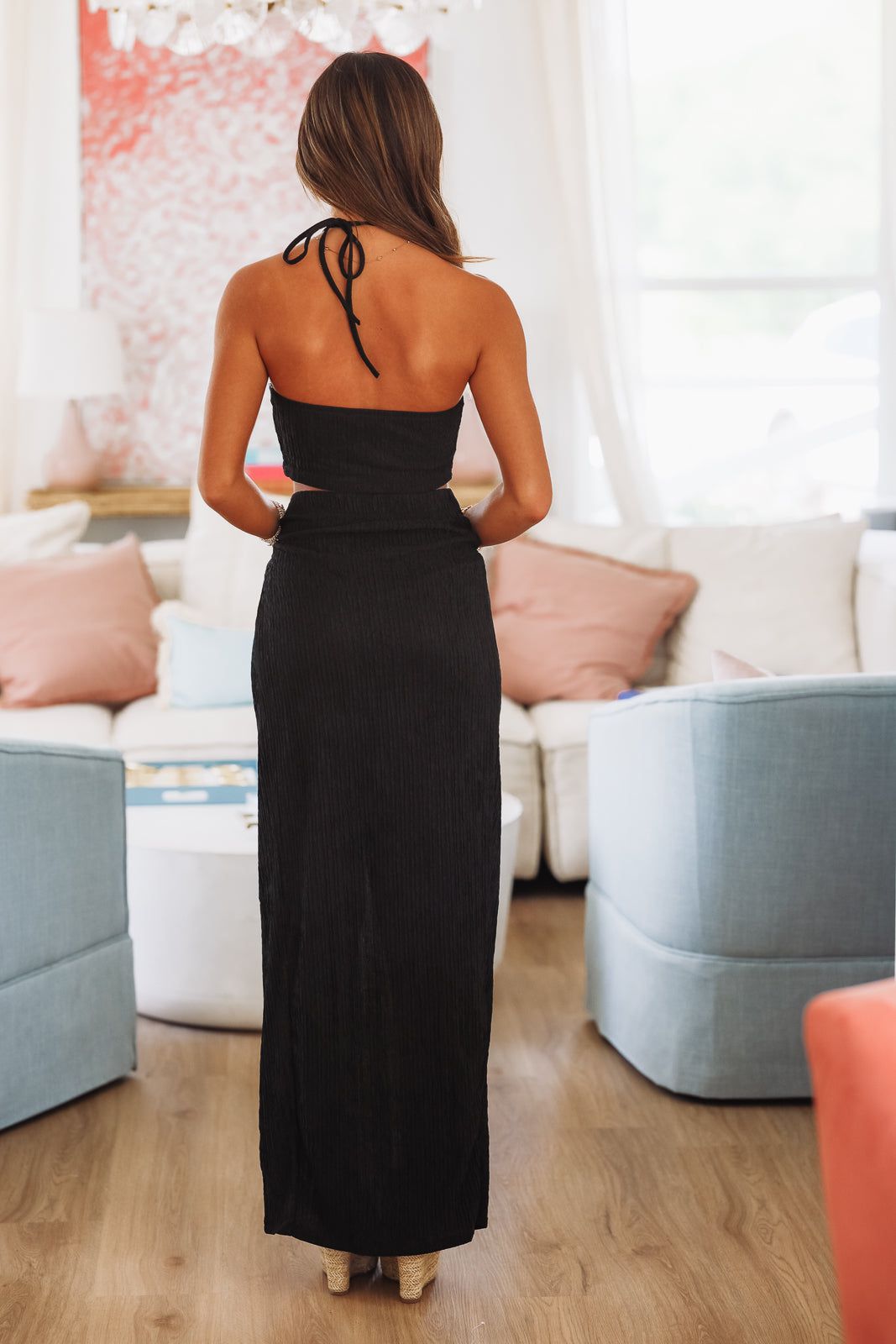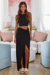 This set is perfect! We love the halter neckline and the twisted waist detail on the maxi skirt.