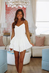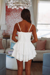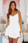 This mini dress has ruched sides and a tiered skirt. The eyelet details are so feminine.