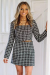 This tweed crop top looks so good with the We're Good Mini Skirt that we also sell.