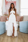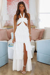This playful maxi dress features charming cutouts and ruffled tiers that add a flirty touch. The rose detail on the halter neckline brings a sweet, feminine vibe, while the smocked back ensures a comfortable, easy fit. Perfect for twirling through sunny days in style!